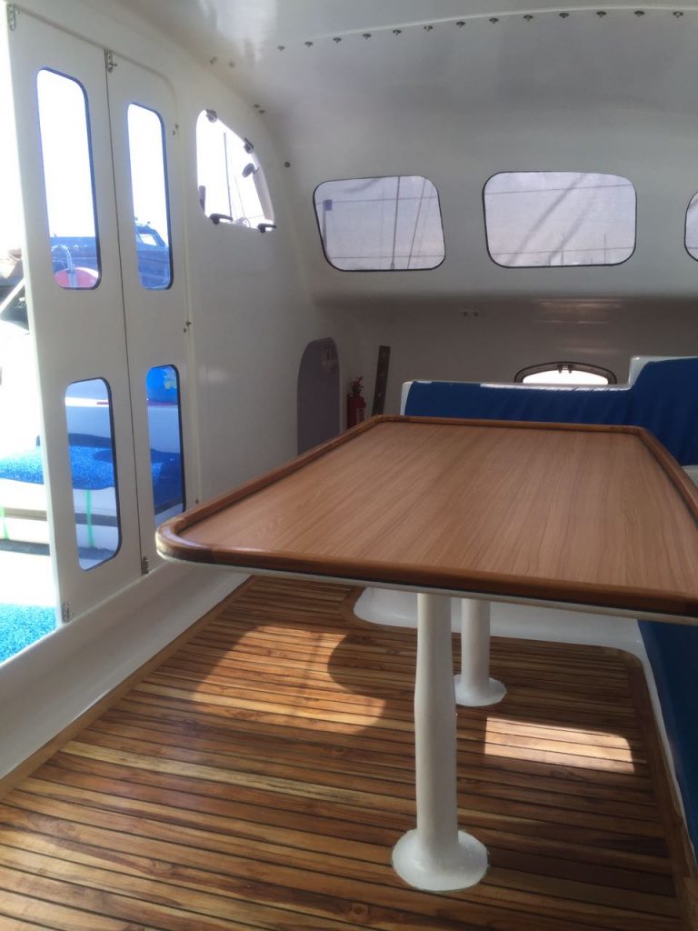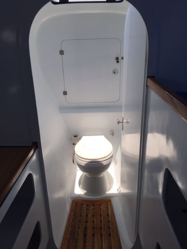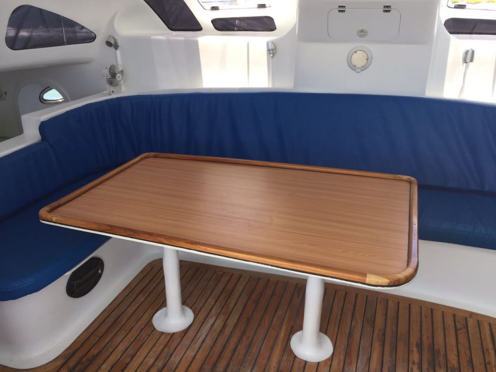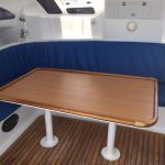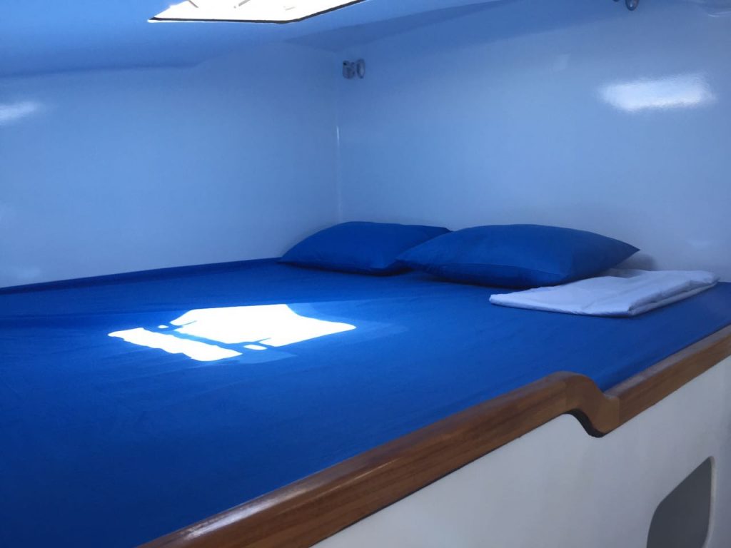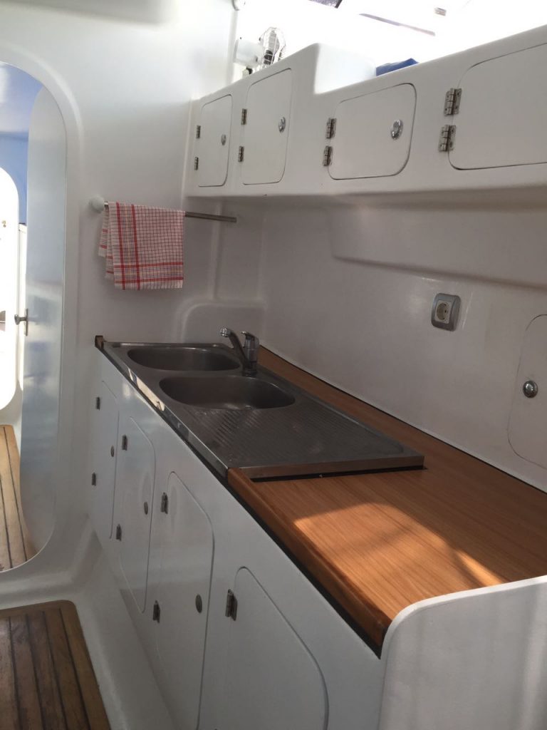 She has a maximum capacity of 12 persons on board for day trips while the 8 berths (3 doubles and 2 singles) and two bathrooms allow for a 5 or 6 person capacity for longer charters.